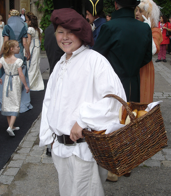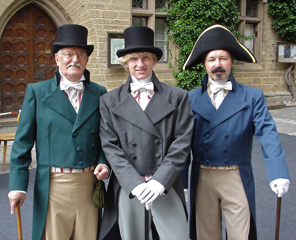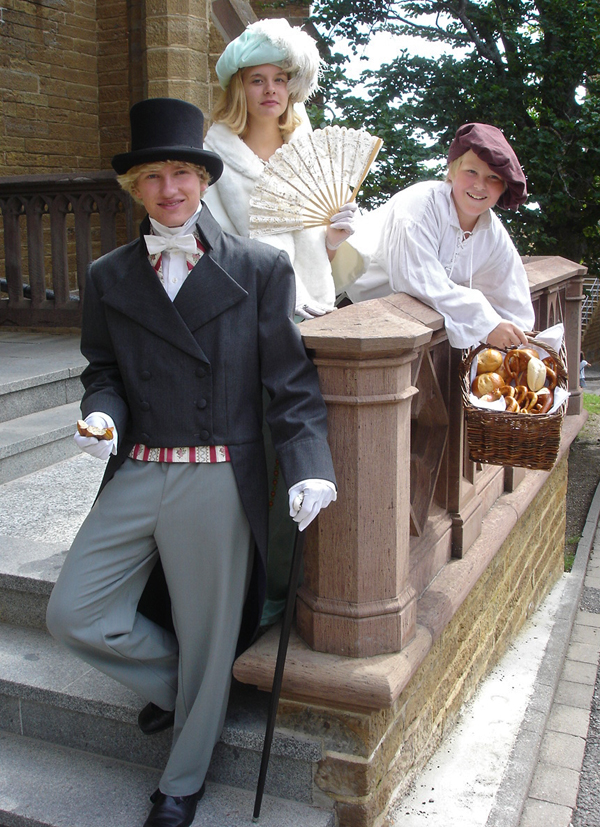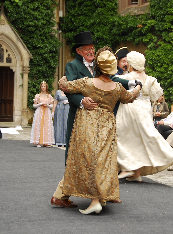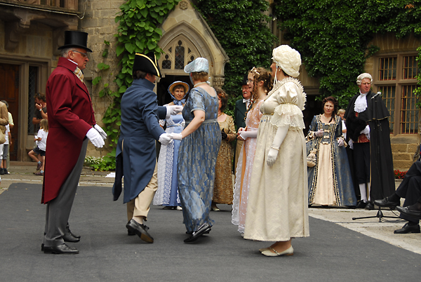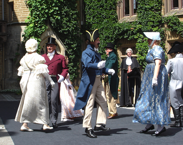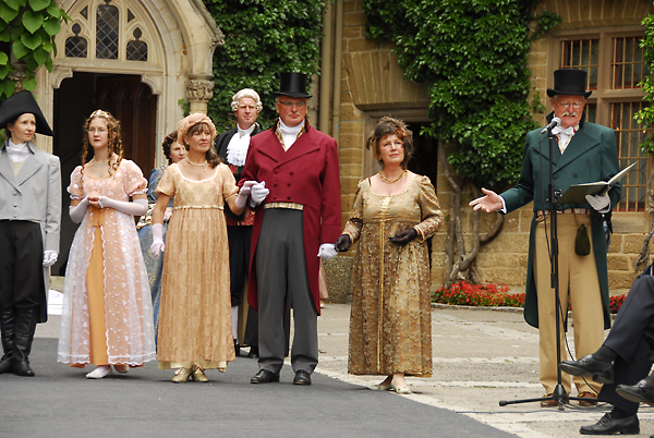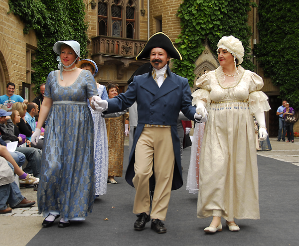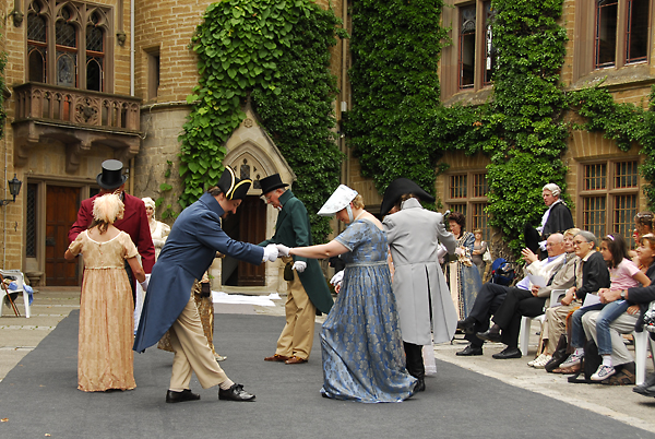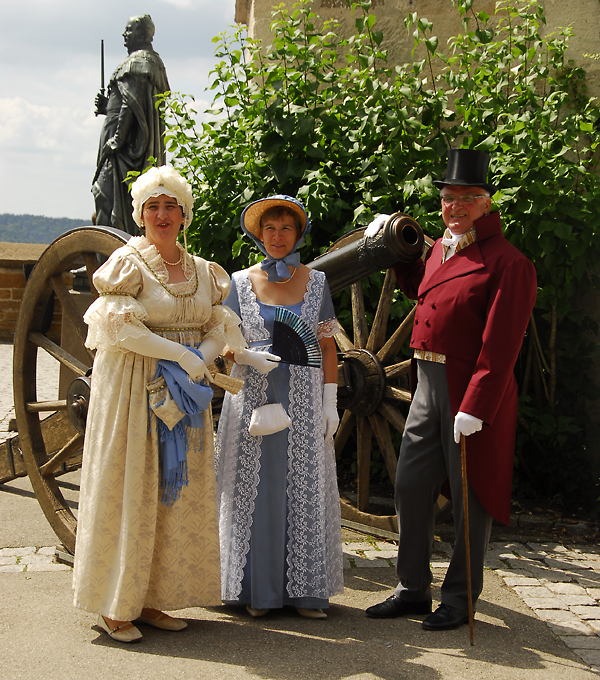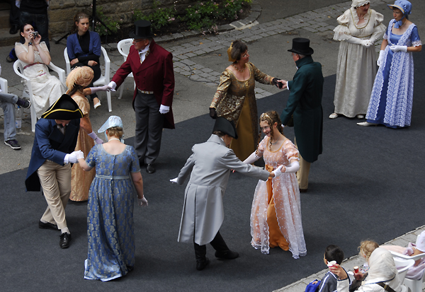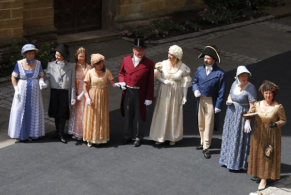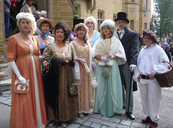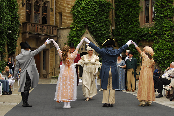 In ihren Empire-Kostümen flanierte die Gruppe vor ihren Auftritten durch den Innenhof der Burg. |