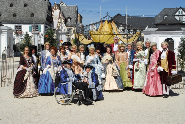 Die Tänzerinnen und Tänzer der Schlosstanzgruppe flanierten durch das Festgelände und beantworteten Fragen des Publikums. Hier ist die gesamte Gruppe zusammen mit Freunden im Schloßhof zusammengekommen, um sich den Fotografen zu stellen. |