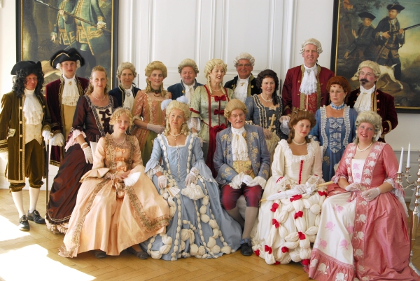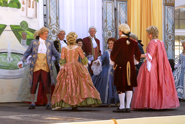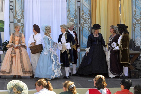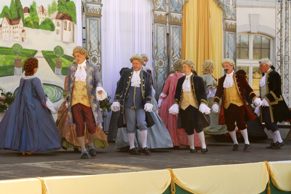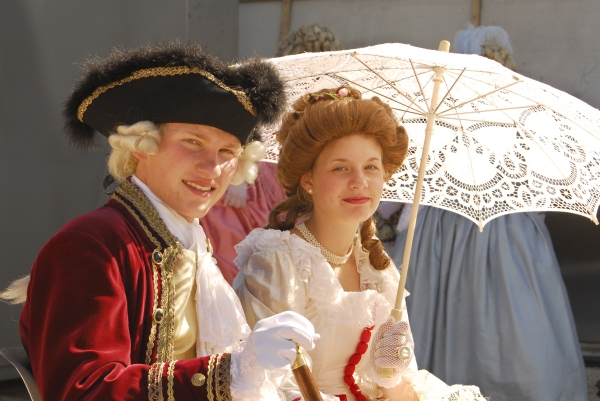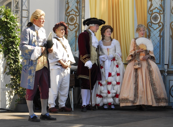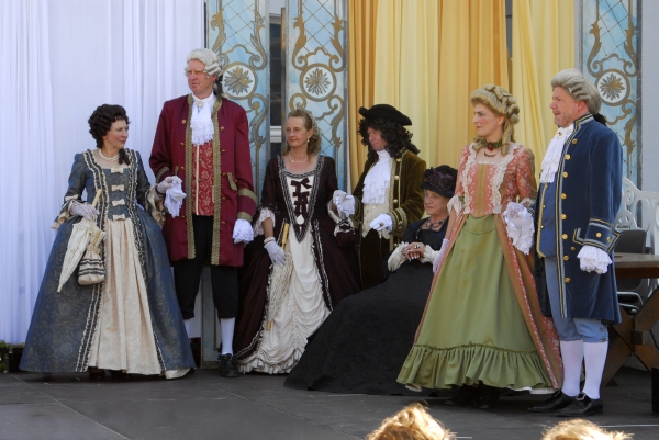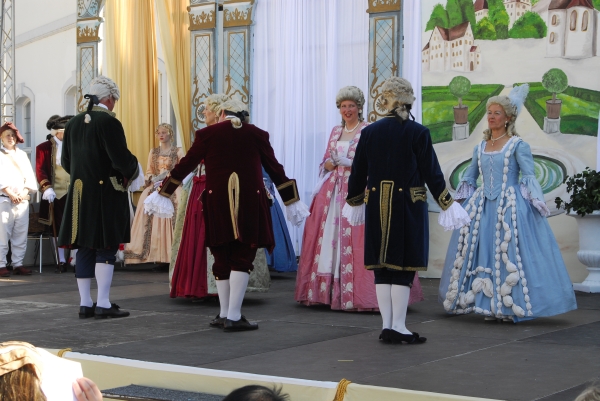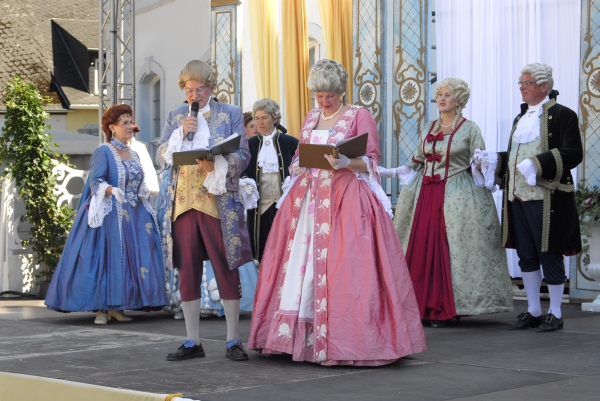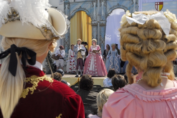 Auch andere Besucher des Barockfestes, ebenfalls kostümiert, verfolgen die Darbietungen und die Erläuterungen zu den Tänzen mit Interesse. |