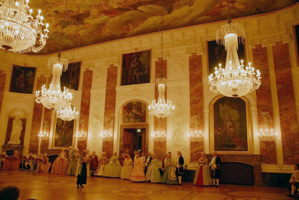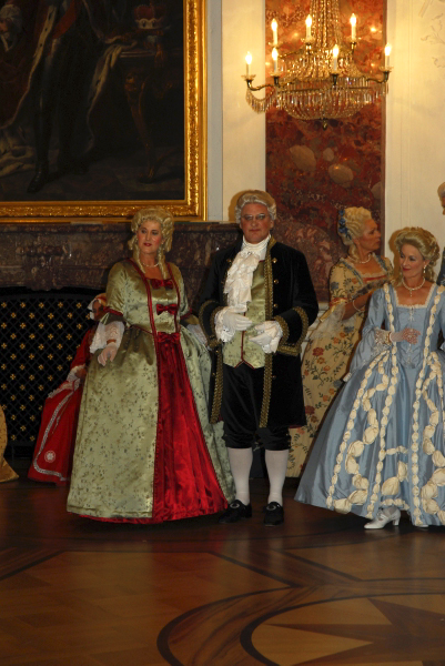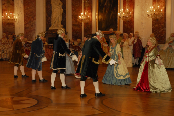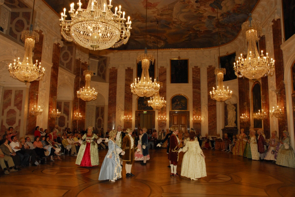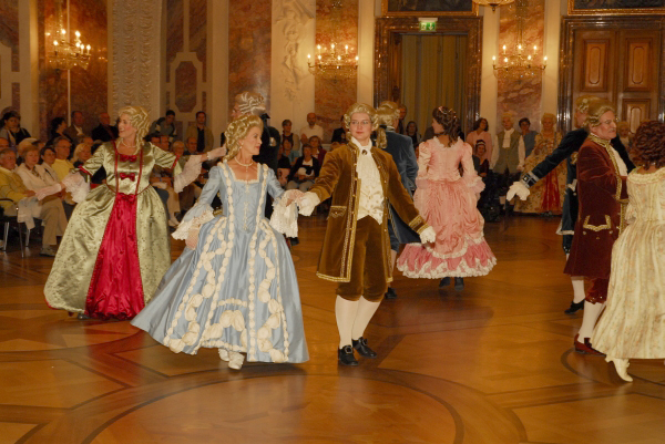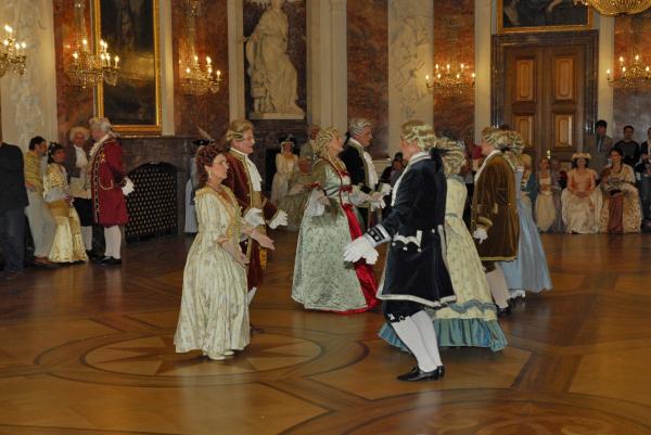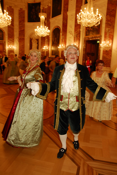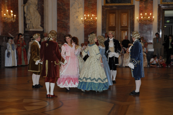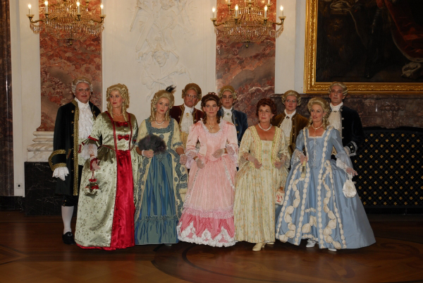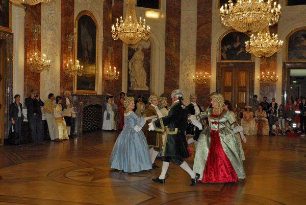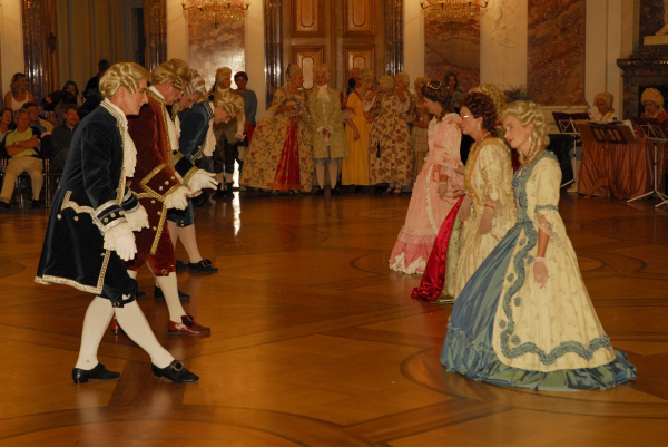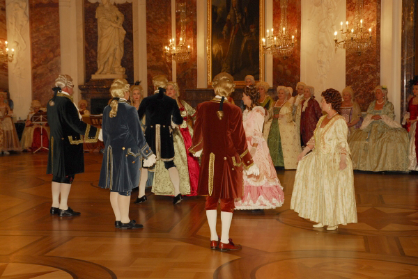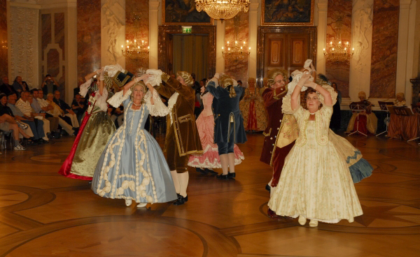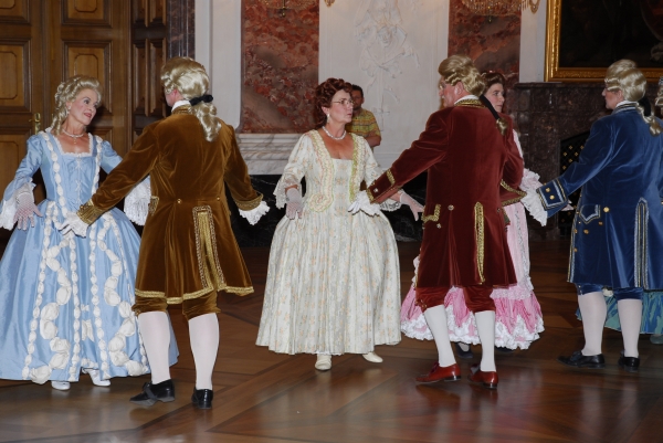 ![]() Die Tänzerinnen und Tänzer in ihren historischen Gewändern ergänzen sich bestens mit der historischen Umgebung im Schloss Mannheim |